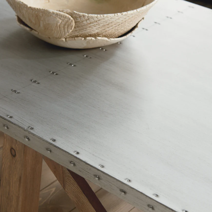 The Junction Truss Cocktail Table combines an industrial metal frame with a spacious surface, perfect for creating a stylish centerpiece in your living room.